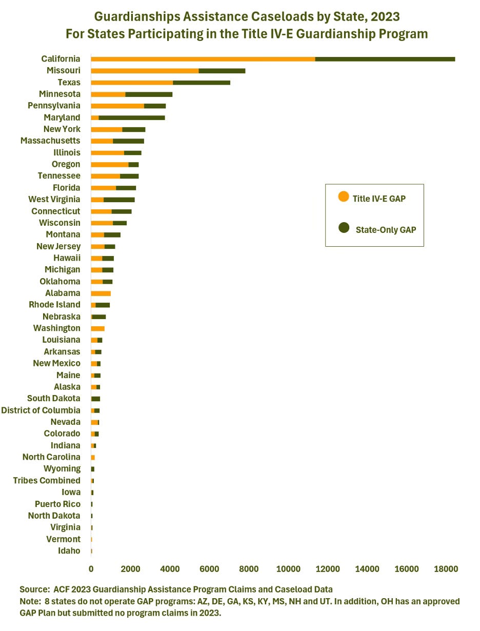 By 2023, 42 states, the District of Columbia, Puerto Rico, and 11 Indian tribes operated GAPs and claimed federal match for guardianship subsidies on behalf of over 45,000 children.