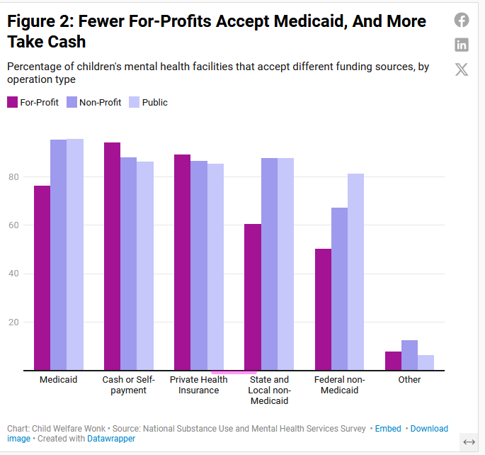 We looked at what funding sources children’s mental health facilities accept, and differences by who operates a facility - whether it’s a for-profit, non-profit, or government-run facility. The data don’t permit looking at funding amounts.