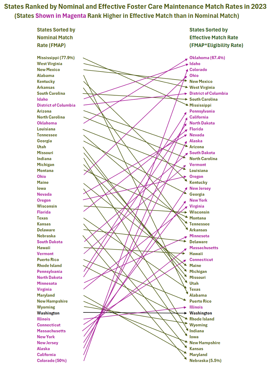 To understand federal foster care funding — and its shortcomings — we need to look at effective match rates (FMAP x Title IV-E eligibility rate), which reflect the actual share of costs reimbursed.