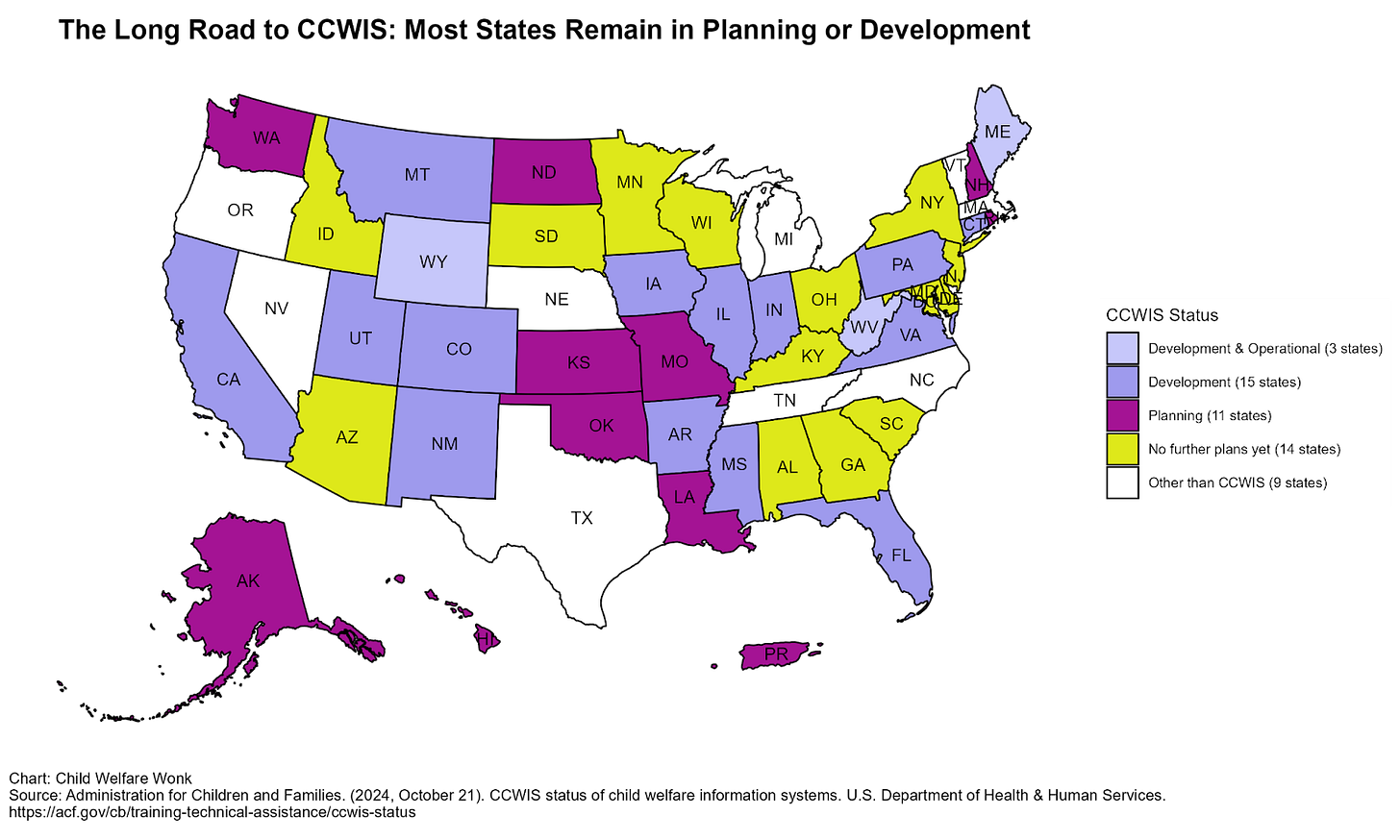 Nearly a decade later, 43 states (including DC and Puerto Rico) have “declared” a CCWIS, but progress varies widely: