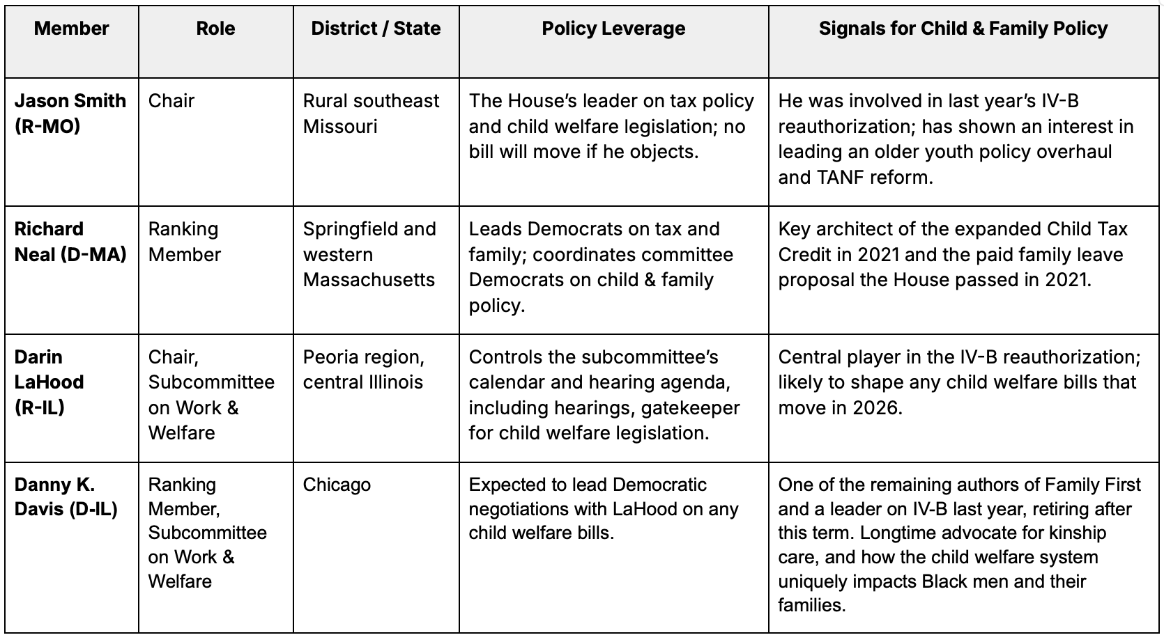 Ways & Means is where federal child and family policy meets fiscal power. Congress’ oldest committee oversees taxes, child care (mandatory funds), TANF, and much of federal child welfare funding, including Title IV-E.